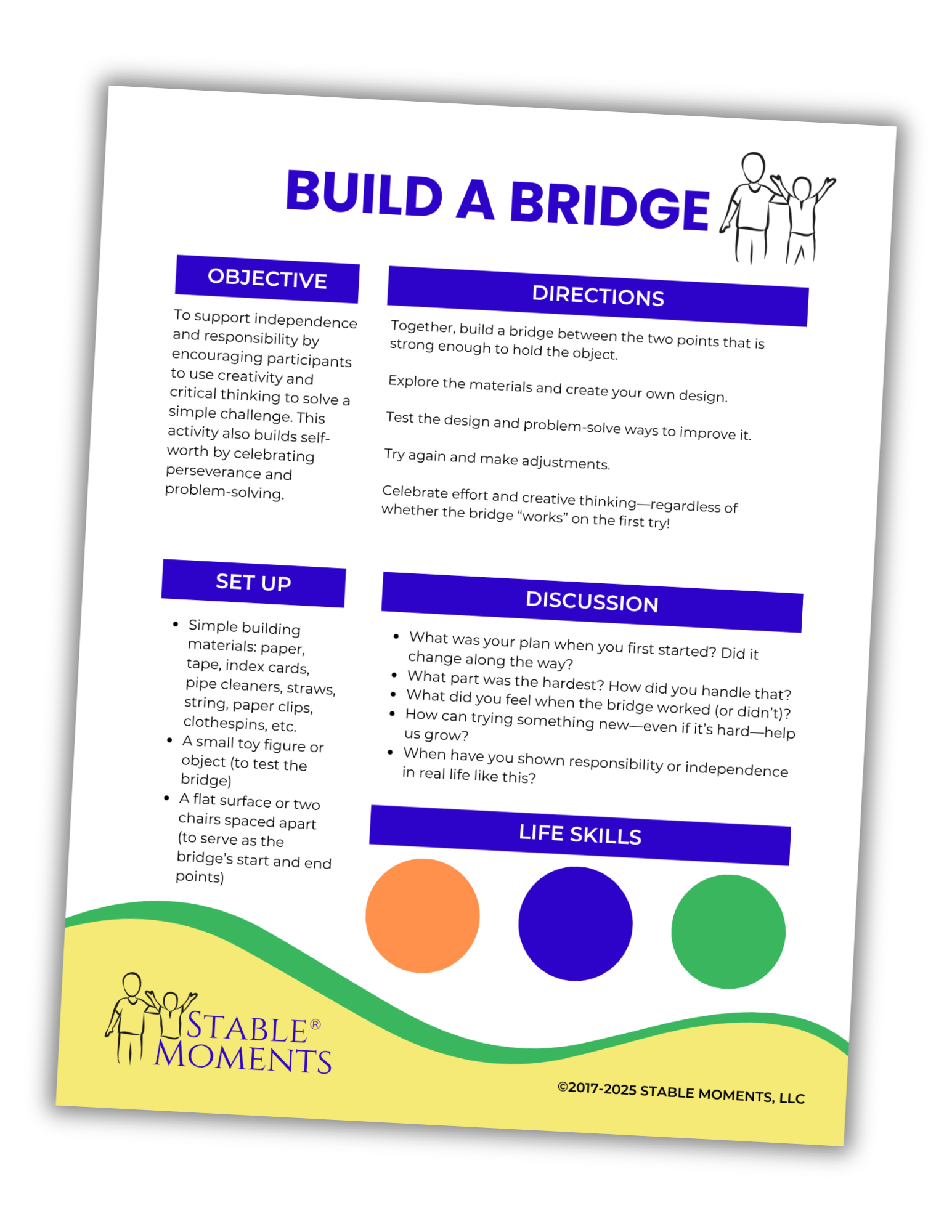 The objective is to support independence and responsibility by encouraging creativity and critical thinking to solve a simple challenge. It also builds self-worth by celebrating perseverance and problem-solving.